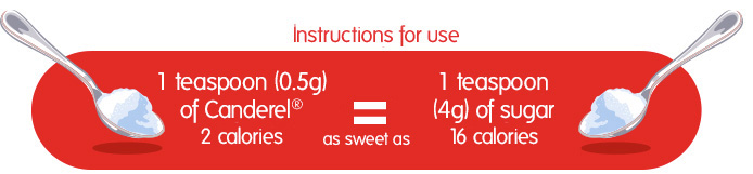 Canderel® Granules can be used spoon for spoon in cooking and baking. Divide your sugar quantity by 8 when weighing e.g. 80g of sugar = 10g of Canderel®. The Canderel® jars have specially designed lids that are perfect for sprinkling and dusting