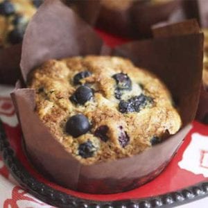 3. Spoon the mixture evenly between the paper cases then top each one with remaining blueberries, pushing them slightly into the mixture. Put in the oven and bake for about 25-30 mins until risen and golden. Eat on day of baking.
